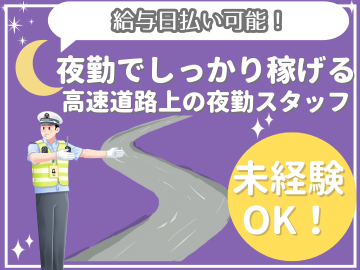 休日休暇 | 休日休暇 【シフト制】 1週間に1回の自己申告制! 高速道路の案件は土日休みが多く、 メリハリつけて働けます♪ 【稼ぎたい金額ご相談下さい】 「日勤のみ」、「夜勤のみ」、「月収●●円」 などあなたに合った働き方を一緒に考えます! アルバイトでも入社3ヶ月から有給GET! 消化率も98%越え♪ |