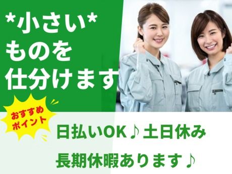 職種/仕事内容 | 仕事内容 \ここがポイント/ ★日払いOK&土日休みで働きやすい♪ ★長期休暇ありで私生活も大切に◎ *・。・。*・。・。*・。・。* <仕事内容> 倉庫内で部品の仕分け作業を行います。 ・伝票の内容を見ながら部品を準備 ・数量チェックや簡単な梱包作業 ・入荷部品の選別・仕分け作業 ・指定された棚へ整理していく作業 取り扱うのは小さな部品がメインなので 重い物はほとんどなく負担も少なめ◎ 就業後の業務変更は一切ありません。 安定した内容で長く続けられるお仕事◎ *・。・。*・。・。*・。・。* |