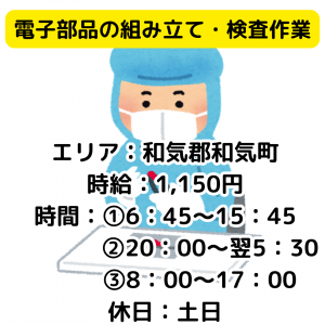 職種/仕事内容 | 仕事内容 工場内での電子部品の 組立検査作業をして頂きます。 【主な仕事内容】 ・電子基板の組み立て ・顕微鏡検査 等が、メインの業務です。 ■工場・製造職は、学歴や経験は一切不問! ■無資格未経験から初めて正社員を目指せるお仕事です。 ■ぜひ異業種への転職として挑戦してみませんか!? ~職場の人間関係が不安だな、という方へ~ ・年齢、社歴問わずに意見を提案しやすい職場 ・困ったこと、悩みを相談しやすい職場 こうした職場で働けるようしっかりサポートします。 ~資格もスキルもないから自信がない、という方へ~ 実は工場・製造ワークをしている方の80%は未経験スタート。 コツコツ作業が好き、実は、集中して作業するのが得意。 更にいつも一歩先を考えながら仕事をしていた接客業経験者は 仕事にすぐに慣れて、職場で必要とされる人になるはずです。 |