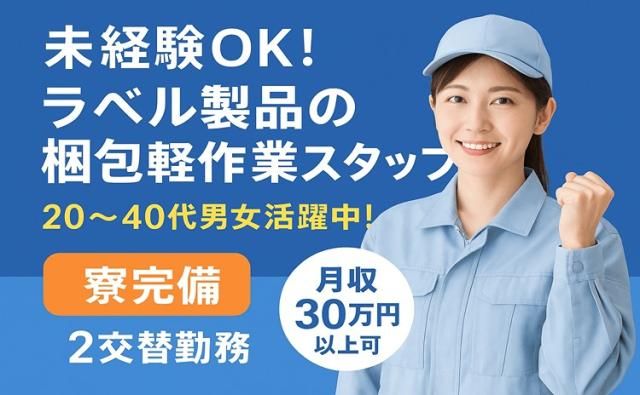 月収30万円以上可!未経験から始められるラベル製品の梱包スタッフ 派遣社員 有名企業のラベル製品を扱う工場で梱包スタッフを募集!20~40代男女が多数活躍中で、未経験からでも安心してスタートできます。シンプル作業中心なので初心者でも取り組みやすく、体を動かすことが好きな方にピッタリ。時給1,300円スタートで、2交替勤務により安定して月収30万円以上も可能。家具・家電付きの寮完備で遠方からの応募も安心。働きやすい環境でしっかり稼ぎたい方におすすめです。