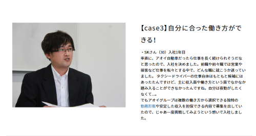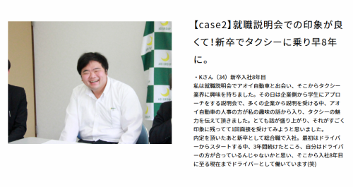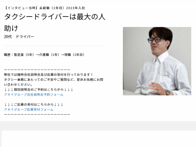 職種/仕事内容 | 仕事内容 ―――――――――――――――――――― 今タクシー業界に、若い力が新風を吹き込んでいます ―――――――――――――――――――― アオイグループでは、20代・30代の若手ドライバーが多く在籍しており、それぞれのライフスタイルに合わせて活躍しています。 「若いのにタクシー?」そんな固定観念は、もう過去のもの。 「家族との時間を大切にしたい」「夢を追いながら安定収入を得たい」「接客としてのやりがい」...様々な理由で、若い世代が続々と入社しています。 どんな理由でタクシードライバーを選び、今どんな毎日を送っているのか。 3名のリアルストーリーをお届けします。 【新人からベテランまで約30名の乗務員インタビューを掲載中!】 https://recruit-aoi-group.com/interviews <今回ご紹介する20代・30代の転職成功ストーリー> 【Case1】20代・「人の助けになる仕事」を求めて 不規則な生活から転職、社会貢献への想い 【Case2】30代・営業、接客...転々としてきた30歳の決断 職を転々とし...ついに腰を据えて働ける仕事と出会う 【Case3】30代・新卒から8年、タクシー業界でキャリアを築く 就職説明会での出会いから始まった、異色のキャリア ー ―――――――――――――――――――― 若手ドライバーが語る三者三様のストーリー ―――――――――――――――――――― 【「人の助けになる仕事」を求めて】(20代・入社1年目) 前職の介護職はやりがいのある仕事でしたが、生活リズムが不規則でなかなか家族との時間が取れない状況。 転職活動をする中で求人を調べていくうちに、タクシードライバーの求人にたどり着きました。 -入社の決め手は「人」の温かさ- 入社を決めたのは面接官の人柄と会社の雰囲気。 まだ若いということもあり、先輩には声をかけられることも多く、色々なことを教えてもらっています(笑) ▼お客様との会話で変わった自分、、、 続きはインタビューでページで! https://recruit-aoi-group.com/interviews/2421 ー 【営業、接客...転々としてきた30歳の決断】(30代・入社1年目) 営業や接客など仕事を転々とする中で、どんな職に就こうか迷っていました。 タクシードライバーの仕事自体はもともと候補にあったんですけど、収入面や働き方という面でなかなか踏み入ることができなかったんです。 自分は夜勤がしたくなくて.. -アオイだから決断できた理由- アオイグループは複数の働き方から選択できる独特の勤務形態や安定した収入を担保できる内容で募集を出していたので、じゃあ一度挑戦してみようという想いで入社しました。 率直に、アオイ自動車だったら仕事を長く続けられそうだなと思ったんです。 ▼想像以上に自由度の高かったドライバーの仕事とは、、、 続きはインタビューでページで! https://recruit-aoi-group.com/interviews/3148 ー 【新卒から8年、タクシー業界でキャリアを築く】(30代・入社8年目) 就職説明会でアオイ自動車と出会い、そこからタクシー業界に興味を持ちました。 とても話が盛り上がり、1回面接を受けてみようと思ったんです。 新卒でタクシー会社?と思われることもありますが、8年経ったでも後悔は全くありません! -8年続けられる理由は「自分のペース」- 「今日はちょっと頑張って残業しよう」「今日は疲れたし残業はせず早めに帰ろうかな」そういった自分のペースで働く選択できる環境です。 日々メリハリをつけられるので、働きやすい環境にあると思います。 ▼若手がタクシー業界でキャリアを築く選択肢について、、、 続きはインタビューでページで! https://recruit-aoi-group.com/interviews/3148 |