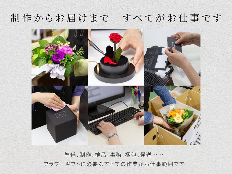 職種/仕事内容 | 仕事内容 勤務開始日は、2026年1月からになります!(面接は2025年12月から随時実施しています。) ◆フラワーギフトのラッピング作業、発送作業 ◆整理・掃除など簡単な軽作業 など ※こちらの求人は、お花やプリザーブドフラワーの製作は行いません 自転車でサッと通勤したい方や接客なしのお仕事がしたい方もぜひご応募ください! 心温まるギフトをお客様へ届けるお仕事です。完成した商品を美しくラッピングし、丁寧に梱包して発送する作業をお任せします。 お取り扱いするのは、母の日、誕生日や結婚記念日など、大切な方への贈り物ばかり。 箱を開ける瞬間の笑顔を想像しながら、温かい気持ちで働けるお仕事です。 未経験の方でも丁寧にレクチャーしますので、ご安心ください。 |