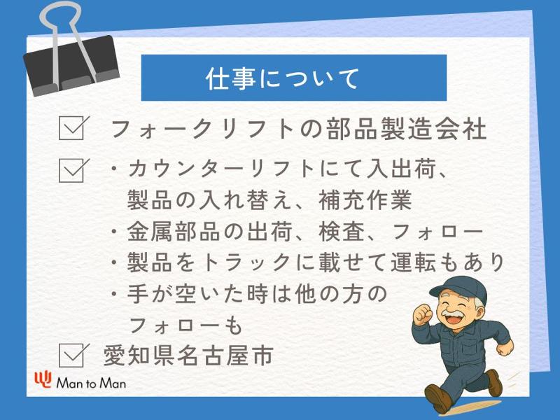 職種/仕事内容 | 仕事内容: 【職種】 産業車両部品に関わるお仕事 【仕事内容】 人気の日勤での工場ワークです! =============== ★20代、30代、40代、50代と 幅広い年齢層の方がご活躍中です。 ★家電付きの寮も完備 ★車通勤OK ★正社員も目指せます! ★福利厚生も充実 今回お任せしたい業務は、 産業車両部品(主に厚物)の検品、 入出荷、部品の供給を行っていただきます。 注文票と照らし合わせたり、 トラックへの積込み、作業者への 部品の供給や回収作業となります。 / 作業はスピードをそこまで 求められないので自分のペースで 行えますよ! \ ご不明点等、いつでもお気軽に お問合せ下さい! ご応募、お待ちしております。 |