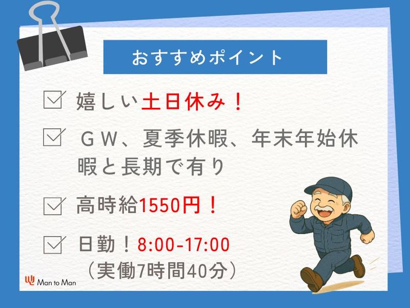 アピールポイント: 【20~50代男性活躍中】日勤&土日休み&残業少なめ