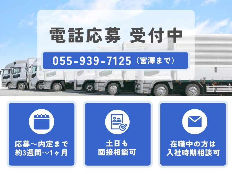 職種/仕事内容 | 仕事内容 ●月給制のため、長期休暇がある月も 収入が大きく下がりにくい給与設計です ●大型免許・フォークリフト免許必須のため 業務内容と応募条件にズレがありません ●運行内容は事前に共有し 無理な運行は組みません ●試用期間中も給与・条件は本採用と同じ ━━━━━━━━━━━━━━━━━━━ 【仕事内容】 企業様への一般貨物配送(中長距離)です。 ■配送エリア:西は兵庫県、東は福島県 ■積み降ろし:パレット積み中心 ※一部バラ積みあり ■荷役方法:自主荷役 ■車両:10tトラック(専用車両) ━━━━━━━━━━━━━━━━━━━ 【職場環境】 ・30代~50代のドライバーが在籍 ・業務を共有しながら対応する体制あり ━━━━━━━━━━━━━━━━━━━ 【同業他社からの転職を考えている方へ】 ■配車内容や運行スケジュールは 事前に共有します ■無理な運行を前提とした配車は行いません ■収入は「運行回数・出勤日数・残業時間」 によって決まる仕組みです → 内容を理解したうえで働けます ■条件や運行についての相談もできる環境 =================== 電話応募・質問もお気軽にどうぞ! 055-939-7125(宮澤まで) =================== |