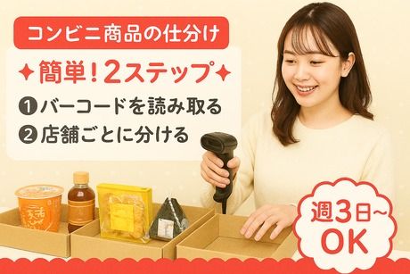 職種/仕事内容 | 仕事内容 コンビニ商品の仕分けスタッフ大募集! 超カンタンな倉庫内作業です♪ 【お仕事内容は】 ●扱うもの…コンビニの人気商品 1.バーコードを"ピッ"と読み取る ↓ 2.店舗ごとに分けていく! ⇒たったこれだけ!作業は2ステップ♪ とってもカンタン!スグに覚えられますよ◎ 【勤務地について】 高槻市玉川 ☆交通費全額支給 ■バス◎高槻市駅より「玉川口」徒歩すぐ ■バス◎茨木市駅より「西切」徒歩7分 車・バイク・自転車通勤もOK! バス停もスグだから、バス通勤もおすすめです◎ |