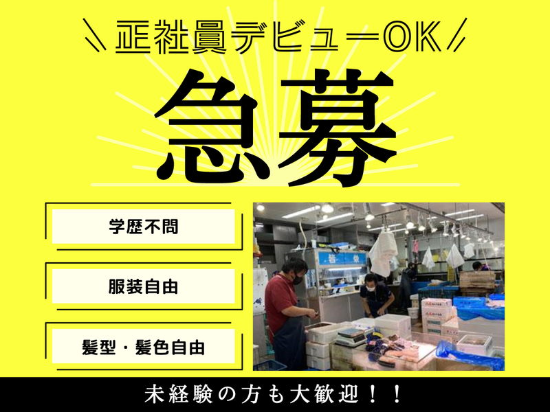 対象となる方 | 求めている人材 《学歴、これまでの職歴など一切不問》 ◎普通運転免許をお持ちの方も歓迎! (市場内で"ターレー"という乗り物を 運転します) ◎未経験スタート歓迎! ◎経験者の方は給与を優遇! ================= 《こんな方、ぜひご応募ください!》 ✱自分には「これが得意!」 なんて分野はないけど、 それを見つけるために働きたい! ✱満員電車とは無縁な環境で働きたい! ✱貯金したい! ✱子供の学費を稼ぎたい! などなど働きたい理由はなんでもOK! ================= 《元気な声で返事ができればOK》 先輩たちも「正社員経験がない」 「ビジネスマナーとかわからない」 という人も多かったです。 けど、何より大切なのは、 自分の仕事に責任を持って向き合うこと。 必要なことは一つひとつ教えていきます。 返事をしっかりして覚えていってください。 家庭を持っている人でも 安心して転職できるように、 未経験でも月給35万円も約束します。 一緒に頑張っていきましょう! |