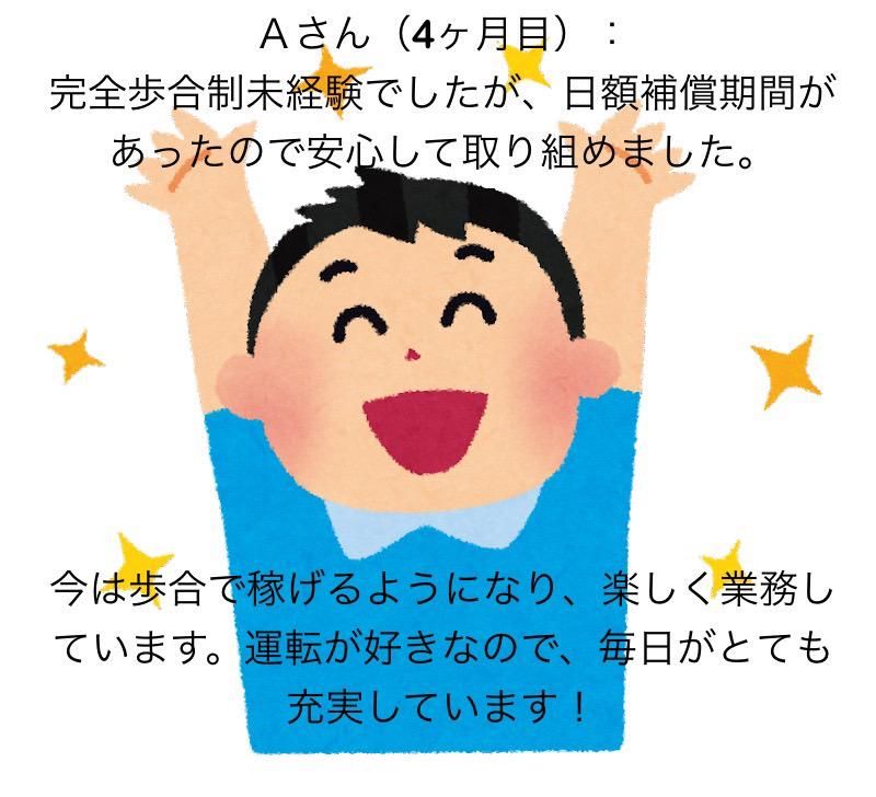 給与 | 完全歩合制 給与詳細 完全歩合制 配達1個につき160円~ (投函荷物は60円~) ※就業地によって条件が異なりますのでお電話の際にご説明します。 未経験は稼働開始から1ヶ月は日額20,000円(税込)の補償をつけることもできるので安心してスキルアップを図れます! 【給与例】 給与例 月収50万円も可能!(日額保障20,000円×25日業務の場合) 〔先輩スタッフから一言〕 ■Aさん(4ヶ月目):完全歩合制!未経験でしたが、日額補償期間があったので安心して取り組めて、今は歩合で稼げるようになり、楽しく業務しています。運転が好きなので、毎日がとても充実しています! ■Bさん(6ヶ月目)経験有:完全歩合制!前の会社さんより好条件のこちらに転職しやった分だけ収入がある完全歩合制の業務をしています。繫盛期にはこれまで稼いだことない金額を手にし、ビックリしました。次の繁盛期に向けて更にスキルアップを目指しています! ■Cさん(2年2ヶ月目):Wワーク!平日は別の仕事をしながら、こちらでは土日祝で配送の仕事をしています。車両も安価で購入手配してもらい、休みの日は収入UPに繋がり嬉しいです! |