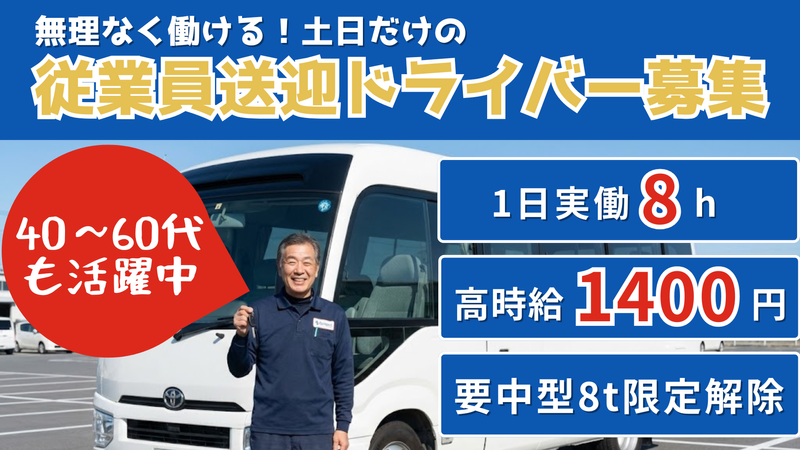 職種/仕事内容 | 仕事内容 工場で働く従業員様の送迎ドライバーを募集中。 週末だけ体に無理なく働いて 今の生活にプラス1万円しませんか? <仕事内容> 従業員様をマイクロバス(MT車)で 工場⇔停留所4か所程度⇔駅へ 送迎していただきます。 その他:車両点検・清掃・洗車・給油 などの車両管理業務もお任せ! <週1日だけでも「月4万円以上」の副収入> 「土曜のみ」「日曜のみ」の勤務もOK! 月4回の出勤でも高時給なので 月収例は44,800円 「今の収入に少しプラスしたい」 というWワーカーさんや 「年金に上乗せしたい」シニア世代にピッタリ。 <中休みの8時間は「自由時間」> 9:30~17:30までは自由時間です。 ・一度家に帰ってゆっくりお昼寝 ・溜まっていた家事や買い物を済ませる ・趣味や副業に充てる等々 予定を勤務日にもできるが嬉しいポイント! 1日を有効活用しながら効率よく稼げます。 「中型8t限定解除」免許があれば、 年齢やブランクは問いません。 40代50代60代の 中高年・シニア世代も活躍中です! MT車の運転にブランクがある方も、 最初は先輩が同乗してサポートするのでご安心ください。 配送・運送業等の別業界での運転経験や タクシー・バスでの乗務職経験ある方も 経験・資格を活かして働きませんか? 「ちょっと気になる」だけでも、 お気軽にご連絡、ご応募ください! |