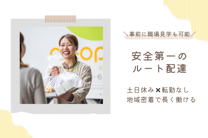 職種/仕事内容 | 仕事内容 「地域担当」商品のルート配達(デリバリー業務)と営業(おすすめ・お誘い) 〇地域限定の正規職員(専任職)の募集です。 転居を伴う異動なし、土日休みでワークライフバランスを取りやすい仕事です。 正規職員は、主に習熟定型業務を担い、初級管理・専門職候補として成長を促し、 将来の中堅職員として活躍することを期待して採用します。登用制度を使い正規職員(総合職) へのキャリアアップも目指せます。 〇宅配事業では1.5t車を使い、毎週定期訪問しながら商品カタログのお届け、受注、応対、 コミュニケーションを通じて信頼関係を構築することが基本業務となります。 月曜日~金曜日までの曜日ごと、担当するルート(組合員さん)が決まっています。 「いつもの曜日」の「いつもの時間」に「同じ担当者」がお伺いする事で、組合員さんと 大変近い関係性を築くことができる仕事です。 仕事の中で「ありがとう」「助かっているわ」など言葉やメッセージをいただくことも多く、 暮らしのお役に立っていることを実感できる仕事です。 〇商品(食料品や日用品)やサービスを通じて暮らしのお役に立つことが仕事なので、定期的に 暮らしに合わせた様々な商品のご提案を行います。また、「コープ共済」といった暮らしのサービスについてもご提案を行います。 新規利用者拡大では 生協を未利用の地域の皆様に、「生協の事業や活動」を 知っていただき組合員としてご加入いただく為のお声がけをします。 成約は営業担当が担いますので広報に近いお声がけです。 〇業務ではトラック(1.5t車)を使いますが、入職後は、安全運転訓練や約2ヵ月間の 先輩職員による同乗支援を行ないながら、無理なく業務に必要な知識やスキルが 習得できる体制が整っています。 全員が未経験からのスタートです。 |