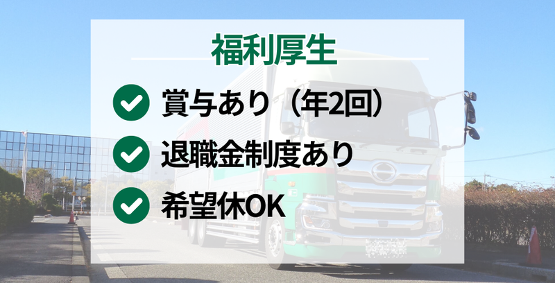 待遇・福利厚生 | 【保険制度】 雇用保険、労災保険、健康保険、厚生年金 【福利厚生】 福利厚生 社会保険完備 賞与あり 昇給あり 交通費支給(規定あり) 入社祝い金あり(規定あり) <頑張り応援> 努力賞 デジタコ賞 無事故表彰制度 退職金制度 誕生日プレゼント 同僚との食事代や旅行費補助 手積み手当あり(規定あり) 荷物手当あり(規定あり) ※明示すべき労働条件については、面談時にお伝えいたします。 |