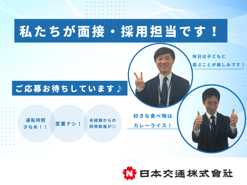 対象となる方 | 求めている人材 【普免取得後3年以上(AT限定可)】 ✅二種免許の取得は会社がサポート! →お持ちの方は優遇 ✅転職回数は不問 ✅未経験者95%以上 ✅年齢不問/性別不問/経験不問 ✅未経験者歓迎/経験者優遇 ⭐営業、販売、サービス経験は 職務内容に活かせます。 30代、40代のミドル層はもちろん、 20代の第二新卒から50代まで幅広く在籍。 ★求職者の声★ ・40歳男性(乗務員/勤務3年目) 元々は営業マンとして、 家電製品のルート営業をしておりました。 しかし、数字にこだわるあまり、 本来お客様が求めているものとは 違うものを販売したり、少しでも 高く売れるように工夫したり… そんな生活に疲れてしまいました。 日本交通の募集を見たとき、 すぐに応募しました。 ・ノルマなし ・顧客ファースト ・安定待遇 など、自分にとっては嬉しい環境だったからです。 ホスピタリティを追求するこの仕事こそ、 私の求めていたものでした。 お客様に向き合える仕事がしたい。 その思いを叶えられる環境です。 ぜひ皆さんもご応募してみてください。 |