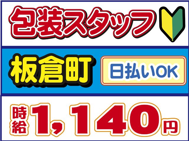 職種/仕事内容 | 仕事内容 板倉町にある企業でのお仕事です 扶養内やWワークでの勤務もOK 【包装スタッフのポイント】 〇未経験OK 〇週2日~勤務OK 〇土日祝休み 〇時給1140円スタート 〇人気の日勤 〇20代30代40代50代の男女活躍中 〇即日勤務OK 〇日払いOK(規定内) 〇履歴書不要 〇交通費支給(規定内) 【包装スタッフの仕事内容】 洗剤の包装や その他の付帯業務をお願いします。 簡単な作業なので未経験OK 〇職場見学OK(30分~1時間程度) 【勤務について】 ・日勤のみ(9時~16時半) ※週2日から勤務可 ・土日祝休みでプライベート充実 急な発熱・体調不良・冠婚葬祭など 突発的なお休みに柔軟に対応しております。 【こんな経験活かせます】 特別な経験・資格は 必要ありませんのでご安心ください。 下記経験者は前職活かせます。 〇長期アルバイト・パート 〇製造パート・アルバイト 〇軽作業パート・アルバイト 〇梱包・箱詰めパート・アルバイト 〇主婦・主夫パート 〇中高年パート 前職不問で採用しております。 コーディネーター・定着支援のWサポート体制導入 「マイリク定着支援」導入企業! アンケートで職場の様子を確認し、 コーディネーター・定着支援担当が連携してサポート。 はじめての派遣でも安心して働けるよう迅速かつ 丁寧にサポート対応いたします。 ご不明な点はお気軽にお問い合わせください お電話でのご応募、ご質問も受付中 株式会社ロフティー太田支店 TEL0800-222-6888(フリーダイヤル) お仕事情報など採用ページはこちらから https://entori.jp/loftyota |