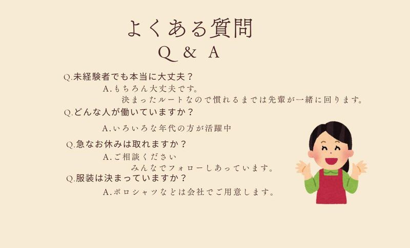 対象となる方 | 求めている人材 ※要普通自動車運転免許 ★年齢不問!未経験OK! ★主婦・主夫・お子様の手が離れて 社会復帰をお考えの方、大歓迎! ★お客様に元気な挨拶ができればOK! ★スタッフ全員未経験スタートです! |