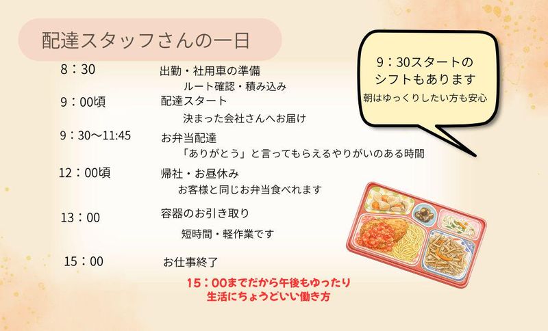 職種/仕事内容 | 仕事内容 ★~★~★~★~★~★~★~★~★~★ <年齢不問>普通免許でできるお仕事! 決まったコースの為、未経験でも安心♪ 主婦活躍中♪小さいお子様がいても安心! ★~★~★~★~★~★~★~★~★~★ 【仕事内容】 企業向けのお弁当のルート配達や回収 業務です!営業はありません! 最初は先輩と一緒に仕事の流れを 覚えてくださいね! 【普通免許でOK!】 ワンボックスカーでの 配達・回収のお仕事です! 未経験の方やお仕事復帰に ブランクのある方でも大丈夫です♪ 丁寧に教えます! 扶養内勤務もOK! タイプも年齢もバラバラだけど、スグに 馴染める明るい雰囲気が自慢です♪ 子育てと両立して働く主婦さん 多数活躍中!「パートがきっかけで世界が 広がった!」というブランク明けの 主婦さんもいます☆ |