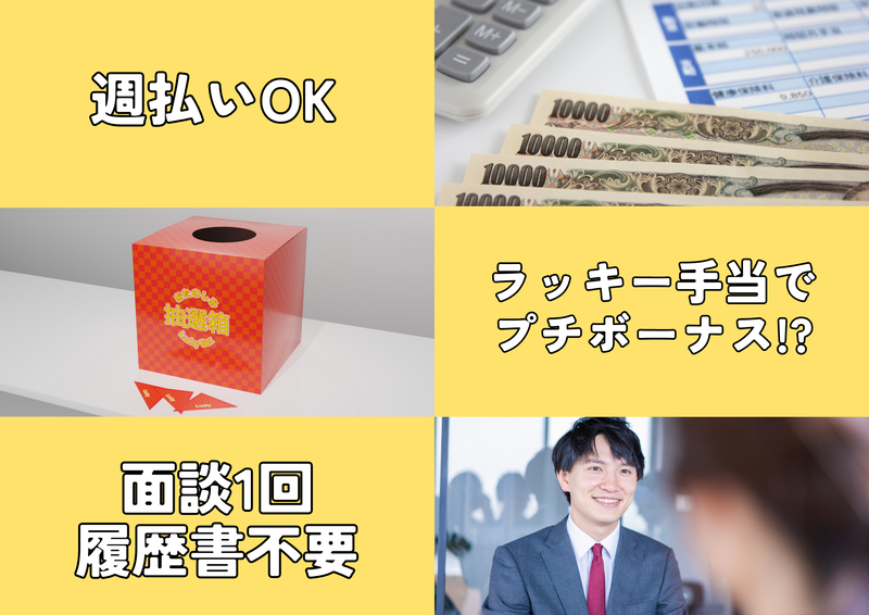 給与 | 時給1,300円 給与詳細 基本給:時給 1300円 *交通費支給 *定着支援金あり(1万円/規定) 【給与例】 給与例 <気になる月収例はコチラ!> ■1日5h勤務の場合 月収14万3000円 時給1300円×5h×週5日勤務 (月22日稼働) <ラッキー手当あり!> 月に1回、くじ引きを実施! |
