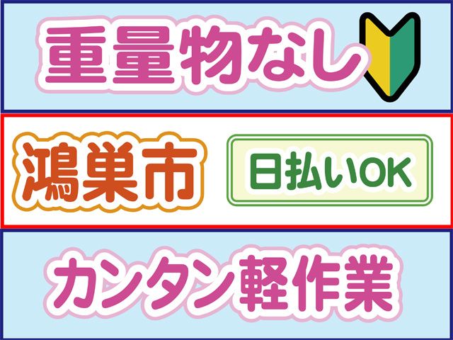鴻巣市×軽作業!日勤&土日休みで働きやすさ抜群! 未経験歓迎!男女活躍中!履歴書不要&日払いOK