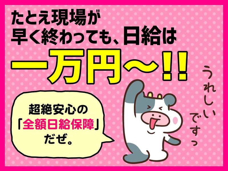 職種/仕事内容 | 仕事内容 ★-★ オドロキの高収入を手軽に実現 ★-★ 1現場につき日給は1万円~です。 ※夜勤の場合は1万2000円~! ここからがすごいんです。 各現場は基本8時間ですが、予定時間よりも早く終わることもあります。その場合でも、日給は満額支給!!「日給全額保障」っていうウチで超人気のシステムなんです。 しかもしかも、希望によっては1日に複数現場をまわることもできます。 つまり… 1日2現場(日勤+夜勤)をまわれば日収2万2000円~。 3現場(日勤+日勤+夜勤)なら日収3万2000円~!! こんなに効率よく稼げる仕事、 あんまりないと思います(笑)。 ★-★ さらにさらに… ★-★ お給料は月払いだけじゃなくて、「日払い」「週払い」も選べちゃいます。日払いなら当日に全額手渡し!翌日なら振込も可能です。 ※週払い・月払いの場合も手渡しor振込を選べます。 ごめんなさい。まだまだあります。週3日~勤務OK!短期・単発もOK!長期でじっくりももちろん熱烈歓迎!レギュラーで入ればめっちゃめちゃ稼げます! 入社祝金もあり!しかも10・万・円!※規定あり ★-★ 個室寮(しかも新築)も完備! ★-★ TVや冷蔵庫、洗濯機などの家電はもちろん、布団やWi-Fiといった生活に必要な「全て」が揃ってます!新生活をスタートさせたい方にも、最高の環境です! ★-★ 具体的なお仕事内容 ★-★ 様々なイベントにおける設営・撤去・警備の仕事です。軽作業が多く、難しくありません。 ★-★ 面接に履歴書は不要! ★-★ 手ぶらでお越しください。ちなみに、採用率は実に99%!未経験の方もご心配なく。合格者には初出勤後、面接時の交通費も支給します。 ★-★ 選考だってスピーディー! ★-★ ご来社いただいて、面接・説明は30分程度!合格すれば翌日からさっそく勤務スタート可♪ |