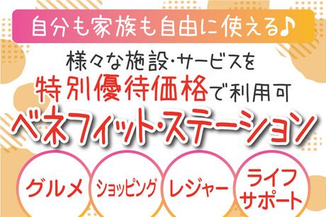 待遇・福利厚生 | 【保険制度】 雇用保険、労災保険、健康保険、厚生年金 【福利厚生】 待遇・福利厚生 【福利厚生】 ・社会保険完備 ・交通費全額支給 ・週払いOK(規定) ・有給休暇 ・制服貸与/制服通勤OK ・車、バイク通勤OK ・空調完備 ・紹介キャンペーン ※ご紹介くださった方1名につき6万円進呈(規定) 【その他福利厚生】 ・定期健康診断 ・キャリアアップ支援制度 ・ストレスチェックの実施 ・子ども手当あり ・結婚、出産、入学祝い金あり ・退職金制度あり ※各々、社内規定に基づく ★トーコーで働くと利用できる福利厚生サービス「ベネフィット・ステーション」! グルメやレジャー、ショッピングだけでなく 育児や介護などライフイベントに関わるものまで、 【約140万件以上】の各施設・サービスを特別優待価格にてご利用いただけます。 スタッフさんはもちろん、ご家族の方もお好きなだけ利用できます。 |