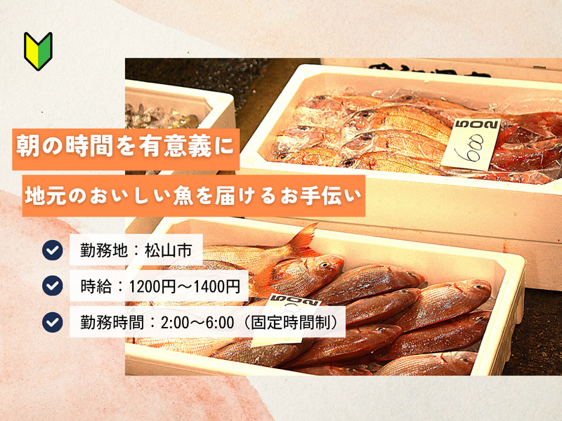 職種/仕事内容 | 仕事内容 ★朝2時スタート→朝6時には退勤! ★お魚好き歓迎!先輩と一緒に競りを覚えられる ★朝早く、終わるのも早いので子育て世代にぴったり! 【お仕事について】 市場での仕入れや競りのサポートをお願いします。 主な業務は… ・仕入れた魚の仕分け・運搬 ・納品準備や片付け作業 ・競りや仕入れ作業の補助 難しい作業はありません。 先輩スタッフがしっかり教えるので、未経験でも安心して始められます。 午前中心の仕事なので、午後は家事や趣味の時間に充てられます! 【こんな方におすすめ】 ・魚が好きで、魚に関わる仕事をしてみたい方 ・朝の時間を有効に使いたい方 ・市場の活気ある雰囲気が好きな方 ・子育てと仕事を両立したい方 ・午前中に働いて、午後は家事や趣味の時間を確保したい方 ・少人数でアットホームな職場で働きたい方 【会社について】 創業以来140年にわたって愛媛の食卓に「おいしい魚」を届けてきた”株式会社古新”の鮮魚部門としてスタートした本社。 県内外の大手量販店や小売店、飲食店に新鮮な魚介類を届けています。 愛媛県松山市三津に拠点を構え、旬の魚を仕入れ「魚を通じて愛媛の食文化を支える」ことを使命としています。 活気ある市場で魚と向き合いながら、明るくチームワークを大切に働ける職場です。 【メッセージ】 「魚が好き」「市場の仕事を体験してみたい」 そんな気持ちがあれば大歓迎です! 午前中にサクッと働いて、午後は自分の時間に。 経験を積んで、将来的には正社員として活躍する道もあります。 ぜひ一緒に、愛媛の“おいしい魚”を届ける仕事をしませんか? |