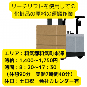 職種/仕事内容 | 仕事内容 リーチリフトを使用しての化粧品原料の運搬業務 作業はシンプル! お化粧品を製造するラインからできた製品をリーチリフトを使用して 運搬する作業です。 ・材料補充 ・商品を決められた場所に置いていく ・流れてきたお化粧品の個数、数量チェック などの、一連の流れの中でお仕事を行っていただきます。 土日祝日休みなので週末のプライベートも充実! なのに高時給のすごいお仕事ですよ! 迷ったらまずは見学だけでもOKです。 ご応募・お問合せお待ちしております! ■「must beだからこそ」お仕事のご紹介特典いろいろ■ ・子育て主婦(夫)さんや自営業やシフトワーク、Wワーク希望の方にもマッチした勤務形態をご紹介。 ・フルタイム、パートタイム、時短勤務などのいろんな働き方の方々を応援! ・日払い、週払いOK!急な出費にも安心のお給与体制があります。(規定あり) ・来社は不要!出張登録OK!あなたのお住まいのお近くの カフェや喫茶店で登録手続きができます♪ ・学歴不問、あなたのやる気を応援、お仕事紹介でサポートいたします! ・学生さん、主婦(夫)(婦)さんから、バリバリ稼ぎたい方、まだまだ働き盛りの50代の方まで、幅広い年齢層の方々が絶賛活躍中! ・交通費支給(規定あり)で働いた分しっかり収入サポート! |