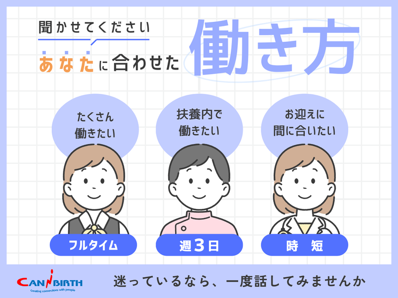 選考プロセス | 選考プロセス 応募ボタンより必要事項を入力のうえ、送信してください。 \\⭐応募後の流れ⭐// ①応募ボタンを押す ▼ ②担当者より、メールまたはお電話にてご連絡 ▼ ③登録面談の日程予約(WEB面談・出張面談・来社面談の中から選択可◎) ※当日予約もOK/スマホ1台で完結 ▼ ④担当者と登録面談(ご希望の働き方などお知らせください◎) ※履歴書不要・私服でOK ※お仕事の休憩中など車内からの面談もOK! ▼ ⑤職場見学 ▼ ⑥双方合意のもと採用決定! ▼ ⑦お仕事スタート 【登録地】 キャニバース株式会社 所在地:埼玉県久喜市野久喜547-17-205 担当者:キャニバース株式会社 採用担当 電話番号:0480470305 メールアドレス:contact@canibirth.co.jp <応募について> WEBまたはお電話にてお気軽にご応募ください。 ■WEB応募の場合 24時間365日、いつでも受付可能です。 確認後、担当よりご連絡します。 ※WEB応募後、応募完了メールがすぐに届きます。 迷惑メールに振り分けられていないかご確認ください。 ■電話応募の場合 0480-47-0305までお電話ください。 受付時間は10時~17時となります。 ※繋がらない場合は時間をおいてお電話いただけますと幸いです。 ※オンライン面談・出張面談をご希望の場合は、WEB応募をご利用ください。 <面接について> オンライン面談/来社面談/出張面談からお選びいただけます。 ご希望があればお申し付けくださいね。 面談ではお仕事に関するご希望のヒアリングや、担当からお仕事の説明を行います。 説明を聞いてからのキャンセル・変更も可能なので、まずはお気軽に面談へご参加ください。 |
