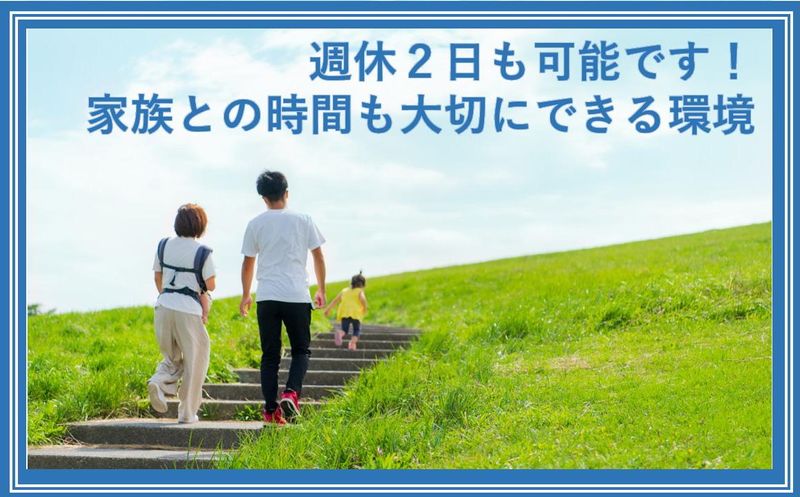 休日休暇 | 休日休暇 日曜日、祝日+隔週土曜日休みも可能。 ※週休2日制も可能です!働き方はご相談下さい! 他、GW・お盆・年末年始 |