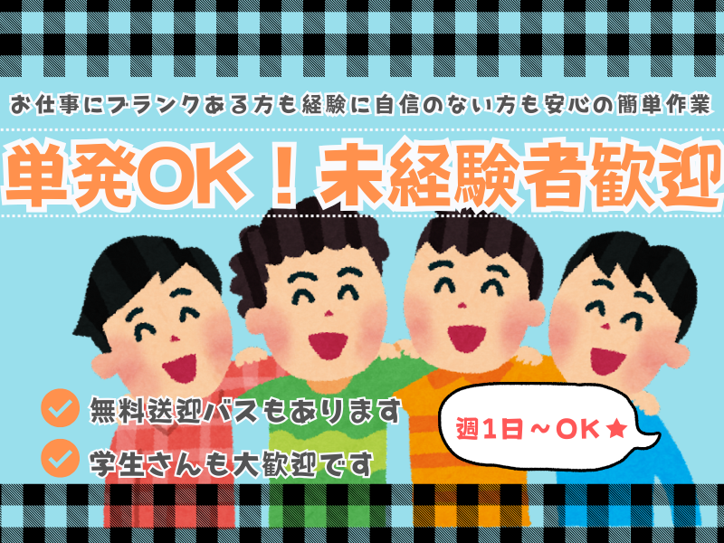 職種/仕事内容 | 仕事内容 \単発・週1日でOK!気軽に応募OK!/ ☘週1日~勤務OK! ☘カンタン、シンプルな単純作業! ☘未経験の方大歓迎! ┌・・・・・・・・・・・┐ 加須市内でのカンタンな 梱包・箱詰め作業です! 花崎駅・栗橋駅より 無料送迎あります └・・・・・・・・・・・┘ 小物商品の箱詰め、梱包作業になります 単純作業でかんたん作業 工場内勤務が未経験の方も 仕事はすぐに覚えられますのでご安心ください。 入社後は弊社がバッチリサポートいたします。 ⭐オススメポイント❗❗⭐  ̄ ̄V ̄ ̄ ̄ ̄ ̄ ̄ ̄ ̄ ̄ ⏩週1日~でもOK ⏩主婦活躍中の職場 ⏩未経験OK ⏩単発OK ⏩大型連休のみOK ⏩週払い対応可能 |