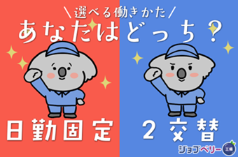 勤務時間 | シフト制 勤務時間 (1)8:00~17:00 (2)20:00~5:00 (1)の日勤固定、(1)(2)の2交替勤務、どちらか選べます。 ※生産状況によりご希望に添えない可能性あり 【休憩時間】計60分 (1)12:00~12:50・15:00~15:10、(2)0:00~0:50・3:00~3:10 【残業】有り(月20~30h程度) |