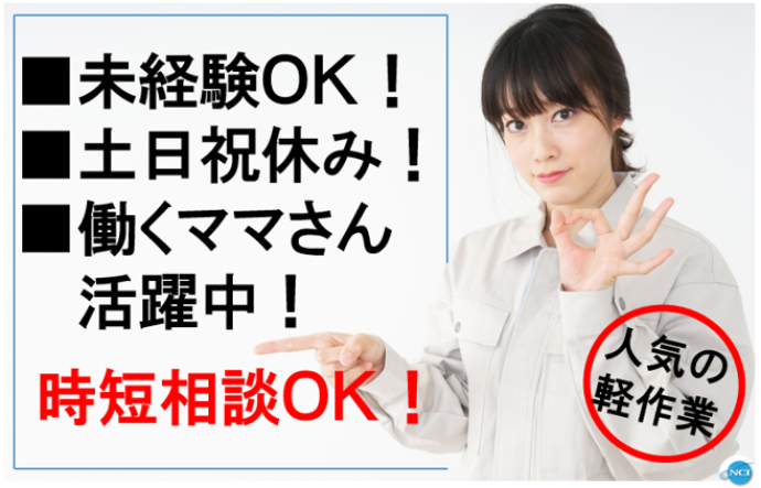 PR・職場情報 =====ここがポイント===== ■土日祝休み! ■働くママさん多数在籍! ■時短相談可! ■工具の使用・重量物の取扱いなし! ■しっかりサポートで未経験でも安心! ==================== ▼安心のフォロー体制▼ 就業してからも当社営業スタッフがしっかりフォローしますので、派遣が初めての方や未経験のお仕事に不安のある方も安心してお勤めいただけます!! 20代~50代の年代の方が大活躍中!お仕事内容の問い合わせだけでもお気軽にどうぞ! 求人の特徴 【お仕事開始までの流れ】 STEP1: 営業社員との面談、登録 STEP2: 職場見学 STEP3: 入社書類取り交わし STEP4: お仕事開始 ※平日18時以降の面談やオンライン対応も可能です。ご希望の方は遠慮なくお問い合わせください! - この求人以外に派遣・バイト・アルバイト・パートや軽作業、製造、事務 のお仕事に興味のある方、短時間、短期・長期歓迎です。 上越市、糸魚川市、妙高市でお仕事をお探しの方、 未経験、ハローワークでお探しの方もお問い合わせください。 - 〒943-0805 新潟県上越市木田2丁目1番1号 7F-2 株式会社 NCI 上越支店 T E L:025-530-7272 F A X:025-530-7283 freedial:0120-62-2011 (※お電話にてご応募の際は「求人サイトを見て」とお伝えください!) 一般労働者派遣事業許可番号:派07-300732 職業紹介事業許可番号:07-ユ-300310 kyo 求人ポイント 交通費支給,即日勤務OK,主婦・主夫歓迎,長期,フリーター歓迎,バイク通勤OK,給料前払いOK,学歴不問,車通勤OK,残業月20時間以内,平日のみOK,転勤なし,未経験者歓迎,リモート面接OK,研修あり,社会保険完備,制服貸与,ブランクOK,育休制度あり,U・Iターン歓迎,家庭都合休OK,禁煙・分煙,長期休暇あり,40代以上応募可,第二新卒歓迎,産休制度あり,週5からOK,産休・育休取得実績あり,固定時間制