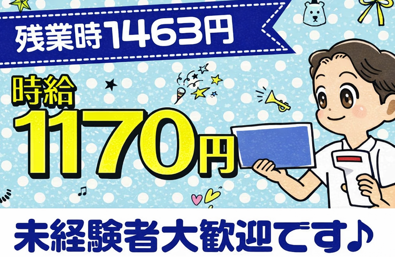 給与 | 時給1,170円以上 給与詳細 基本給:時給 1170円 〜 時給1170円〜 ☆賞与あり!! ☆交通費規定内支給 【給与例】 給与例 【収入例】軽作業スタッフ 時給1,170円 × 7.5時間 × 20日 = 175,500円 ※月の勤務日数により変動します。 ※残業代は発生した場合、別途全額支給(法定通り) |