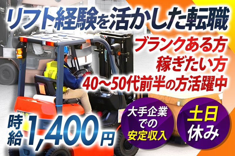 【アピールポイント】 【2交代制のフォークリフトオペレーター募集!】 安定収入とプライベートの両立が叶います! ▶40代~50代前半の方が活躍中! ✅経験者優遇!時給1,400円 ✅安定企業で長期活躍!安心の転職 ✅マイカー通勤OKでラクラク出勤! ✅休日もしっかり取れプライベート充実