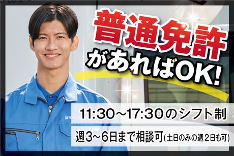 勤務時間 | シフト制 勤務時間 ・勤務曜日:月・火・水・木・金・祝 ・勤務時間: [1] 11:30~17:30 ・最低勤務日数(週):3日 まずは希望される勤務曜日をご相談ください。 月曜から日曜まで毎日勤務は可能なので、まずは希望をお伝えください。 勤務日数や曜日に関しては、面接時にしっかり話し合って決めていきましょう。 実働時間は5時間程度の勤務です。 コースにより5時間以内で終わる場合もあります。 *配送ルートにより勤務時間が多少前後する場合があります。 *交通事情等により終了時間が多少遅くなる場合があります。 *週3日から勤務可能です!曜日はご相談ください。 *もちろん週4日・週5日・週6日などのレギュラー勤務も可能です。 |