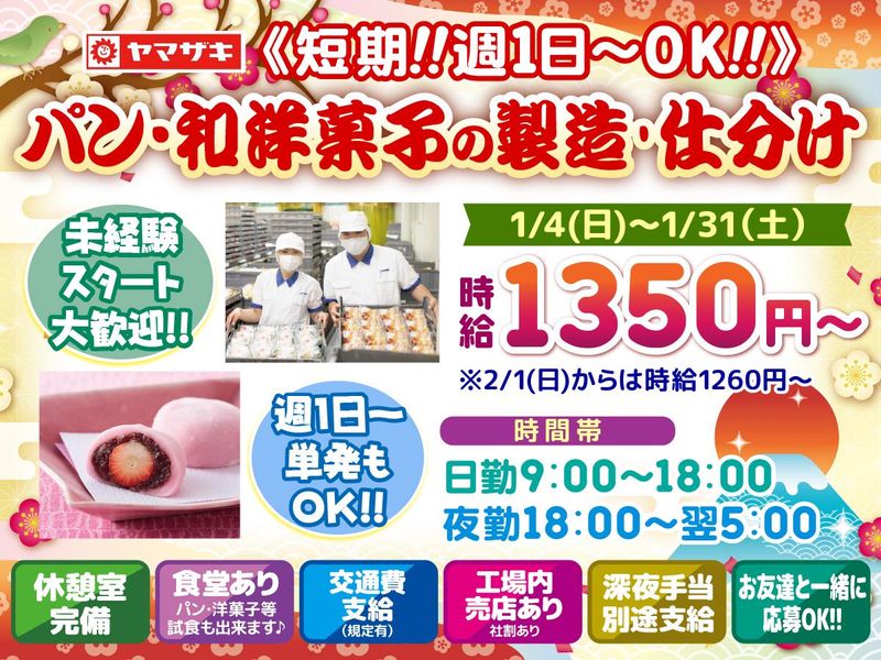 職種/仕事内容 | 仕事内容 ★,。・:'★':・。,★,。・:'★':・。,★,。・:'★' すぐに覚えられるような簡単な作業なので、 軽作業未経験の方でも大丈夫! 経験や知識は一切不問。 気軽に働きたい方にぴったりのお仕事です。 一度覚えてしまえば、 自分のペースでリズムよく、 テキパキ作業できます。 集中していたらあっという間に 退勤時間ということも。 適度に体を動かすので健康にも良いです ★,。・:'★':・。,★,。・:'★':・。,★,。・:'★' 《⭐期間限定時給で稼ぎも◎⭐》  ̄ ̄ ̄ ̄ ̄ ̄ ̄ ̄ ̄ ̄ ̄ ̄ ̄ ̄ ̄ ̄ 下記期間は「時給1350円~」 ⏩1/4(日)~1/31(土) ※詳細は給与欄参照 ※短期アルバイトスタッフのみ =============== ■こんな人が活躍 ●コツコツ、もくもく作業が得意な方 ●座っているより体を動かすのが好きな方 ●几帳面な方 ●倉庫内作業の経験がある方 ●交替勤務のお仕事をお探しの方 ●繰り返しの単純作業が好きな方 =============== ★創業70年以上!! 有名な食パンや菓子パンなどを 食卓にお届けするお仕事です♪ スーパーやコンビニでお馴染みの 食パン・菓子パン・調理パンや和洋菓子、 おにぎりetc… 様々な製品を日々製造しています。 扱う数は約1200種類、 1日の製造数は約3000万個!! 仕込み→成型→焼成の製造工程を経て、 包装して仕分け作業に入ります。 仕事内容も多岐にわたるので 飽きることなく働けます♪ =============== 《交通アクセス》 小平駅より徒歩14分! ⭐バイク・自転車通勤OK! 萩山駅、久米川駅、青海街道駅、 八坂駅、花小金井駅、新小平駅、 一橋学園駅、東村山駅、小川駅、 国分寺駅、田無駅、東久留米駅 …などからもアクセス便利◎ =============== 《応募後の流れ》 応募→説明会・面接→勤務スタート! 応募後、説明会を行い面接を実施します。 【勤務地・面接地までの行き方】 「小平駅」北口より徒歩3分のバス停から ぶるべー号に乗車→ 大沼地域センター公園、下車徒歩5分 当日はラフな格好でOK! 1~2時間程度で終了します。 面接前に聞きたいことなどございましたら、 お気軽にお問い合わせ下さい♪ ※応募書類の返却はしておりません。 =============== ■実際に働いているスタッフの声■ 好きな日にちにシフトを入れられるので 自分の都合に合わせて働けるのが とても助かっています♪ 作業も簡単で気楽ですし、 食堂も363円~と安いので効率良く稼げます。 隙間時間で働けるので、 気づいたら長年働いていた! という方も沢山いらっしゃいます。 |