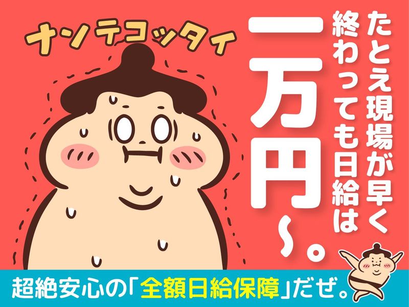職種/仕事内容 | 仕事内容 ★-★ オドロキの高収入を手軽に実現 ★-★ 1現場につき日給は1万円~です。 ここからがすごいんです。 各現場は基本8時間ですが、予定時間よりも早く終わることもあります。その場合でも、日給は満額支給!!「日給全額保障」っていうウチで超人気のシステムなんです。 しかもしかも、希望によっては1日に複数現場をまわることもできます。 つまり… 1日2現場をまわれば日収2万円~。 3現場なら日収3万2000円~!! こんなに効率よく稼げる仕事、 あんまりないと思います(笑)。 ★-★ さらにさらに… ★-★ お給料は月払いだけじゃなくて、「日払い」「週払い」も選べちゃいます。日払いなら当日に全額手渡し!翌日なら振込も可能です。 ※週払い・月払いの場合も手渡しor振込を選べます。 ごめんなさい。まだまだあります。週3日~勤務OK!短期・単発もOK!長期でじっくりももちろん熱烈歓迎!レギュラーで入ればめっちゃめちゃ稼げます! 入社祝金もあり!しかも10・万・円!※規定あり ★-★ 個室寮(しかも新築)も完備! ★-★ TVや冷蔵庫、洗濯機などの家電はもちろん、布団やWi-Fiといった生活に必要な「全て」が揃ってます!新生活をスタートさせたい方にも、最高の環境です! ★-★ 具体的なお仕事内容 ★-★ 様々なイベントにおける設営・撤去・警備の仕事です。軽作業が多く、難しくありません。 ★-★ 面接に履歴書は不要! ★-★ 手ぶらでお越しください。ちなみに、採用率は実に99%!未経験の方もご心配なく。合格者には初出勤後、面接時の交通費も支給します。 ★-★ 選考だってスピーディー! ★-★ ご来社いただいて、面接・説明は30分程度!合格すれば翌日からさっそく勤務スタート可♪ |