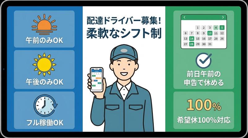 給与 | 月給300,000円~500,000円 給与: 案件により金額変動あり 週払い制度あり(利用時に手数料発生) 【収入モデル(実績ベース)】 スポット・チャーター便のため、日収は案件により変動します(1.0万〜2.5万円前後)。 ・週5稼働:月30万〜40万円前後 ・週6稼働:月40万〜50万円前後 ※時期により変動あり ※日当保証はありません。 ※実際の稼働明細は面談時にご確認いただけます。 |
