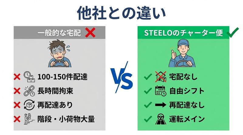 アピールポイント: \他社との違い/ 【一般的な軽貨物(宅配)】 ・100〜150件以上の配達 ・朝〜夜まで長時間拘束 ・再配達あり ・階段移動や小荷物大量 ・シフト固定で融通が利きにくい ・体力負荷が大きい 【STEELO(スポット/チャーター専任)】 ・宅配なし(大量配達なし) ・稼働時間を自由に調整OK ・再配達なし ・走行メイン/軽量物中心 ・前日AMの申告で休める ・無理なく長く続けやすい 【自由度の高い働き方】 勤務日数・稼働時間はすべて自分で調整可能。 加盟金・登録料・解約金等、一切ありません。 【安心のサポート体制】 ・未経験でも始められる研修あり ・トラブル時は提携整備工場が対応 ・車両リースあり(持ち込みOK) 【休みの柔軟性】 ・前日午前の申告で急な休みも取得可能 ・希望休は必ず通る体制 【必要資格】 普通自動車免許(AT限定可) 【歓迎】 ・未経験歓迎 ・学歴・経験不問 ・幅広い年代が活躍中