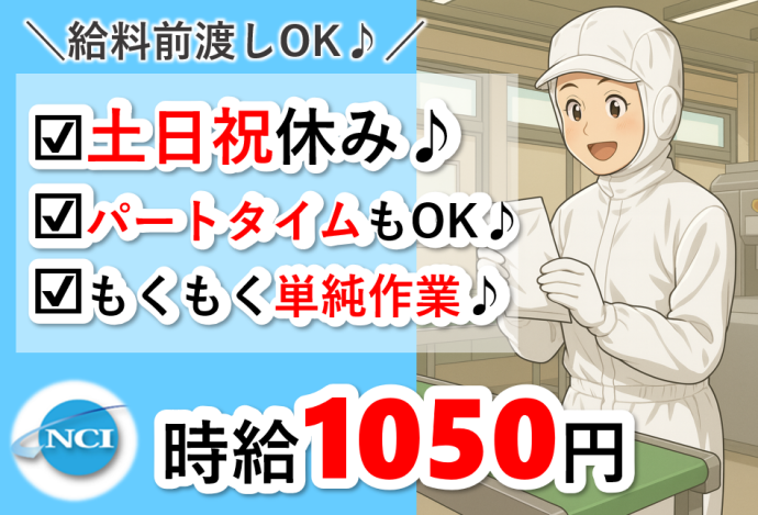 PR・職場情報 =====ここがポイント===== ■未経験歓迎! ■8:30スタート! ■土日休み! ■パート勤務も相談可能! ==================== ▼安心のフォロー体制▼ 就業してからも当社営業スタッフがしっかりフォローしますので、派遣が初めての方や未経験のお仕事に不安のある方も安心してお勤めいただけます!! 20代~40代の年代の方が大活躍中!お仕事内容の問い合わせだけでもお気軽にどうぞ! 求人の特徴 【お仕事開始までの流れ】 STEP1: 営業社員との面談、登録 STEP2: 職場見学 STEP3: 入社書類取り交わし STEP4: お仕事開始 ※平日18時以降の面談やオンライン対応も可能です。ご希望の方は遠慮なくお問い合わせください! - この求人以外に派遣・バイト・アルバイト・パートや軽作業、製造、事務 のお仕事に興味のある方、短時間、短期・長期歓迎です。 上越市、糸魚川市、妙高市でお仕事をお探しの方、 未経験、ハローワークでお探しの方もお問い合わせください。 - 〒943-0805 新潟県上越市木田2丁目1番1号 7F-2 株式会社 NCI 上越支店 T E L:025-530-7272 F A X:025-530-7283 freedial:0120-62-2011 (※お電話にてご応募の際は「求人サイトを見て」とお伝えください!) 一般労働者派遣事業許可番号:派07-300732 職業紹介事業許可番号:07-ユ-300310