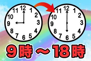 勤務時間 | 固定時間制 勤務時間・曜日 <日勤> 9:00~18:00 (実働8時間/休憩60分) ◆残業少なめ(月10時間程度) ◎勤務時間相談可 |
