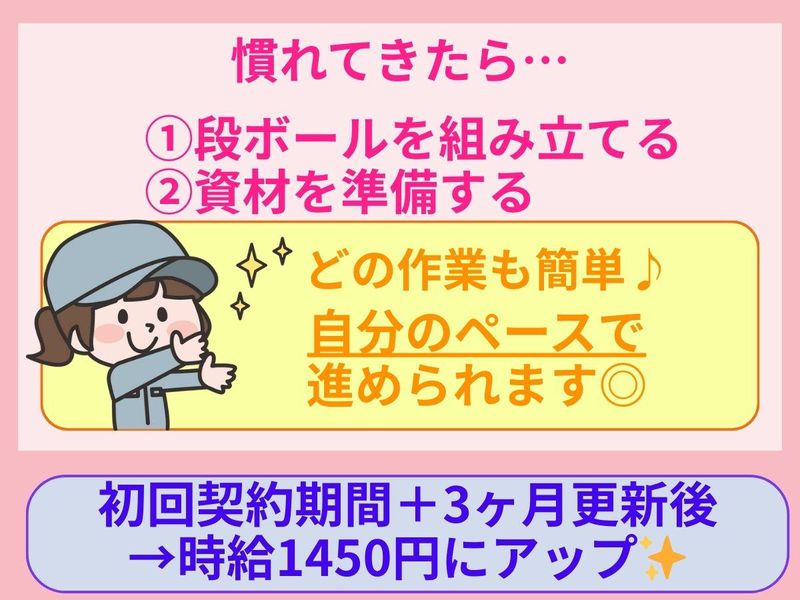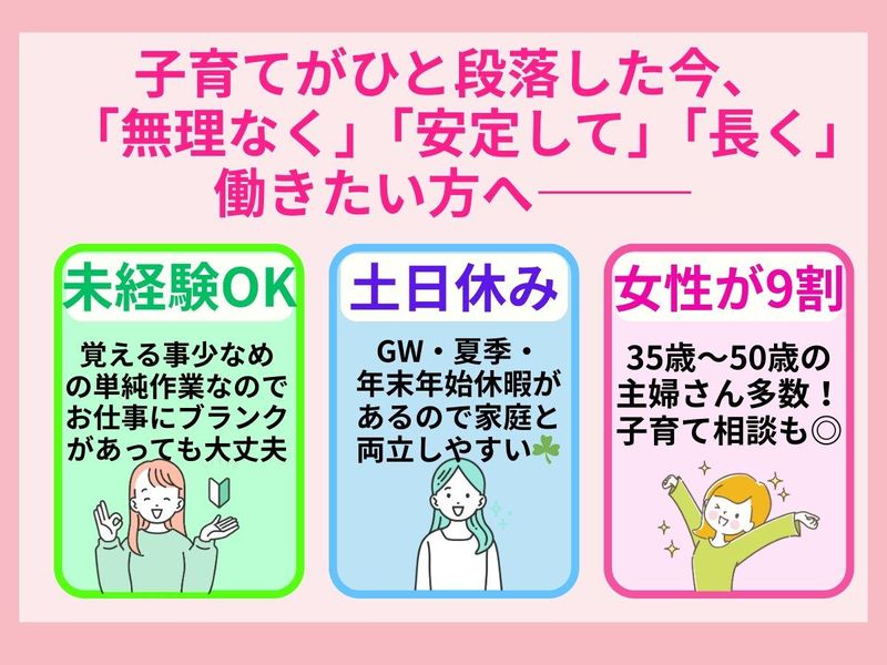 職種/仕事内容 | 仕事内容 ・:・。*。・:・。*。・:・。*。・:・。*。・:・。*。・:・ \女性スタッフが9割の職場です☘/ おまかせするのは 化粧品やハンドクリームなどに使われる 容器のキャップを閉めるだけの シンプル作業✨未経験の方も安心です◎ ・:・。*。・:・。*。・:・。*。・:・。*。・:・。*。・:・ ┌─┐┌─┐┌─┐┌─┐┌─★ │P││O││I││N││T│ ★─┘└─┘└─┘└─┘└─┘ ⭐未経験大歓迎❗難しい仕事内容なし ⭐土日休みで私生活と両立しやすい◎ ⭐GW・夏季・年末年始休みあり ⭐1食250円からの社食あり☕✨ 「子育てがひと段落して、 そろそろ仕事復帰したい」 「家事や自分の時間も大切にしたい」 そんな思いに寄り添う環境です ┏━━━━━━━━━━━━━━━┓ ┃3/31までの限定キャンペーン❗┃ ┗V━━━━━━━━━━━━━━┛ おかえりなさい★キャンペーン実施中✨ 過去に当社より就業頂いた方の再就業で 特別手当3万円を支給します☘(既定あり) ┏━━━━━━━┓ ┃働く会社の紹介┃ ┗━V━━━━━┛ 総合容器メーカーとして化粧品や プラスチック容器などの 製造を行っている会社でのお仕事☘ ┏━━━━━┓ ┃お仕事内容┃ ┗━V━━━┛ ✅化粧品やハンドクリームなどの 容器のキャップを閉めるお仕事✨ ⏩チューブの入れ物に汚れやキズが ないか目視で確認する ⏩キャップをしめる ⏩箱詰め用の段ボールをつくる ⏩資材を準備する ★クリーンルーム内での作業で 最初の1ヶ月ほどはキャップ閉めのみ♪ シンプルルーティンワークが好きな方に おすすめのお仕事です! 黙々と作業するのが好きな方におすすめ♪ ┏━━━━━━━━━━┓ ┃どんな職場環境なの?┃ ┗━V━━━━━━━━┛ ✅社内食堂や診療所・休憩室・更衣室 電子レンジ・冷蔵庫完備で環境充実✨ 昼食は1食250円~とすごくリーズナブル! 社食を食べるスタッフもいれば、 お弁当を持参するスタッフもいます♪ スタッフ同士の雰囲気も良く定着率抜群◎ 長く安定して働きたい、という方にも とってもオススメのお仕事です☘ ★車・バイク・自転車通勤OKで 通勤時間も自分時間を大切にできます⏰ 固定勤務地で移動なし✨ ﹌﹌﹌﹌﹌﹌﹌﹌﹌﹌﹌﹌﹌﹌﹌﹌﹌﹌﹌ ✨パーソルフィールドスタッフの強み✨ ﹌﹌﹌﹌﹌﹌﹌﹌﹌﹌﹌﹌﹌﹌﹌﹌﹌﹌﹌ ⏩長期安心・安定の大手パーソルグループ で働きませんか? ⏩先輩スタッフや専任スタッフのサポート 体制も手厚いので安心スタートが可能♪ ⏩スタッフの定着率も良く 待遇も充実しているので働きやすさ抜群✨ //////////////////////////////////////// 来社なし!ご自宅でラクラク行える オンライン登録&電話面談実施中❗ ╭─────────・⭐・・─╮ お電話での応募も大歓迎です❗ TEL▶▶ 0120-507-117 ╰─・・⭐・─────────╯ //////////////////////////////////////// |