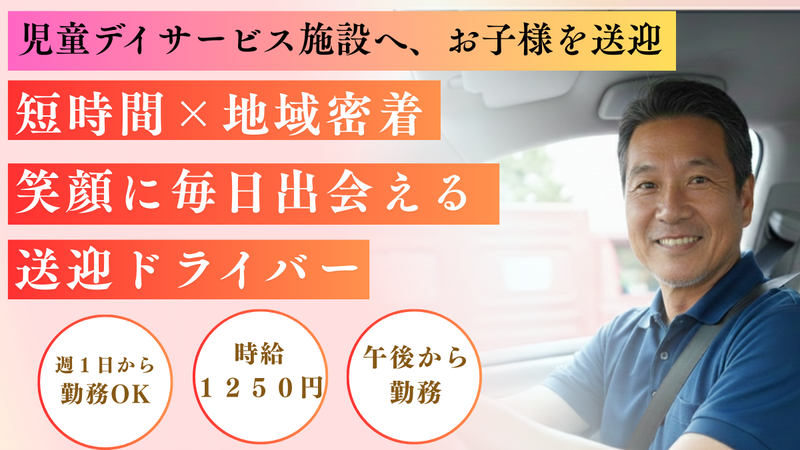 職種/仕事内容 | 仕事内容 \年末年始もご応募受付中!/ ご応募いただいた方には、1月5日以降、採用担当より順次ご連絡いたします。 ★人気職種につき、早期に募集を締め切る可能性がございます★ ★少しでも気になった方は、ぜひお早めにご応募ください!★ 当社は障がいや発達にお悩み持つお子様を対象とし、療育を中心に自立支援を行う放課後等デイサービスを運営しています。 お子様を施設に送迎する運転業務をお願いいたします。 【具体的には、、、】 働き方の例 14:00~ ・社用車で、お子様が通っている学校へ行きます。 ・お子様を乗せたら、施設へ送り届けます。 ・お子様が施設で過ごしている時間は、休憩や車の清掃をお願いいたします。 17:30頃~ ・お子様を施設から、ご自宅に送り届けます。 ・送迎が終わったら施設に車を返して、報告等の業務を行います。 【最初は先輩スタッフが同乗し、送迎ルートの説明・研修等を行っていますのでご安心ください】 【当社について】 埼玉県を中心に、児童福祉事業、就労支援事業をはじめ、就労支援事業と連動した飲食事業など13拠点を展開しています。 強みは、グループ内で就労支援の施設があるため、高校卒業して終わりではなく、ずっと成長を見守り続けられるネットワークがあること。 ご利用者様の大切な時間に寄り添い、自立支援をさせていただくことで関わるすべての人を幸せにすることを目指しています。 雇用期間の定めあり3ヶ月 契約更新あり(原則更新) |