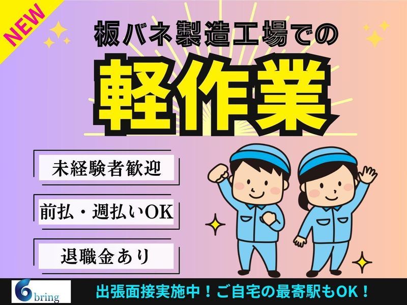 職種/仕事内容 | 仕事内容 \ 未経験スタート大歓迎❗ / ✨製品を重ねるだけのシンプル作業✨ ⏩土日祝休みでプライベート充実☕ ⏩月収25万円以上の安定収入可✊ ⏩通勤便利♪工場付近にバス停あり 働きやすさ……⭐⭐⭐⭐⭐ 稼ぎやすさ……⭐⭐⭐⭐⭐ 難易度…………⭐ ╭━━━━━━━━━╮ ⏬仕事内容はこちら⏬ ╰━━━━v━━━━╯ 製造工場内で車両に使われる 板バネを重ねる作業をお任せ✨ ✅機械から出てくる板バネを パレットに重ねる ✅5枚ほど重ね終わったら 別のパレットへ重ねる ▶▶この作業の繰り返しでOK! その他、付随業務や清掃作業 などもお願いします。 ★重ね終わったパレットは フォークリフト作業員が運ぶので 運搬作業なし♪ 板バネを重ねるパレットは 機械のすぐ横に置いてあります◎ ◌◍┈┈┈┈┈┈┈┈┈┈┈┈┈┈⿻*.· ╭━━━━━━━━━━━━╮ ⛅働きやすさのPOINT⛅ ╰━━━━━━v━━━━━╯ ⭐土日祝休み❗ 完全週休2日制でメリハリ勤務! 予定が立てやすいとスタッフから好評! ⭐前払い・週払いOK❗ 急なお誘いや予期せぬ出費にも 役立つ、スタッフに大好評の制度です♪ ⭐お友達紹介制度あり❗ 紹介したご友人が入社した際に 紹介者に5万円をプレゼント❗✨ ⭐来社なし♪応募~内定まで自宅で完結❗ オンライン面接だから、ラクラク☘ ★入社前に必ず職場見学があるので安心! ╭────────────・⭐・・─╮ .電話番号 ▶▶ 029-869-5900 .お気軽にお問い合わせください♪ ╰─・・⭐・────────────╯ |