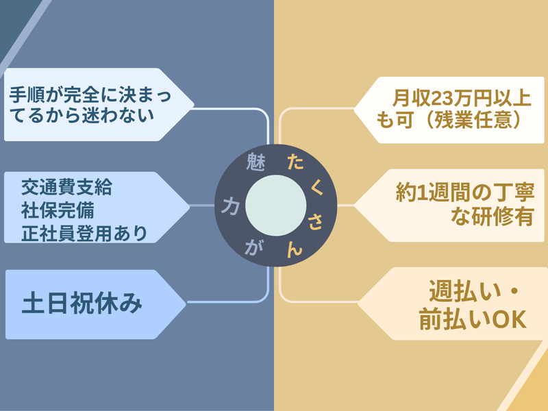 職種/仕事内容 | 仕事内容 【文房具製品の箱詰め・梱包作業】 検査に合格した文房具製品を、出荷用の箱に入れて梱包する作業をお任せします。 ■ 製造経験がある方には働きやすい環境 ◎手順はマニュアル化済み 決められた通りに進めればOK。製造現場での経験がある方なら、作業の流れやペース配分はすぐに掴んでいただけます。 ◎製品は全て軽量 文房具製品なので、重い荷物を持つことは一切ありません。体への負担を抑えた環境です。 ◎作業台の高さ調整可能 座り作業・立ち作業を選べます。ご自身の体調に合わせて無理なく働けます。 ◎空調完備の清潔な作業場 季節を問わず快適に作業できる環境を整えています。 ■ 具体的な業務の流れ 1. 決められた数量を数えながら箱に入れる 2. 緩衝材を詰める 3. フタを閉じてテープで封をする 4. 出荷先や品番のシールを貼る 5. 出荷エリアに運ぶ 製造現場の経験がある方なら、「検品→梱包→出荷準備」の流れはお馴染みのはず。新しく覚えることは、製品と資材の種類、貼付シールのルール程度です。 ■ 研修は約1週間 実際の製品と資材を使って、箱詰めの手順や梱包のコツを丁寧に指導します。 製造業の経験がある方なら、より早く作業に慣れていただけます。製造業が初めての方も、1週間ほどで作業の流れを掴んでいます。 周囲には同じ作業をしている仲間がいるので、わからないことがあればすぐに聞ける雰囲気。新しい職場でも馴染みやすい環境です。 ■ 配属後も継続サポート bring plusの担当スタッフが最低月2回は職場を訪問し、困りごとがないか確認します。 「職場の人に直接言いにくいこと」も、派遣会社の担当者になら気軽に相談できます。一人で悩みを抱える必要はありません。 ■ 1日の流れ 08:00 出勤・朝礼・作業準備 08:15 箱詰め・梱包作業スタート 10:00 休憩(15分) 12:00 昼休憩(50分) 13:00 午後の作業開始 15:00 休憩(15分) 17:00 作業終了・片付け・退勤 ※残業がある場合は事前にお声がけします(月平均10時間程度) ※残業は強制ではありません。ご都合に応じて調整可能です ■ こんな方が活躍しています ✓ 製造業での経験を活かして働きたい方 ✓ 体への負担が少ない環境を求めている方 ✓ 決められた手順をコツコツ丁寧に進められる方 ✓ 長く安心して働きたい方 ✓ 残業少なめで、無理なく続けられる仕事を探している方 ✓ 新しい職場でも、サポート体制があれば頑張れる方 現在、幅広い年齢層のスタッフが活躍しています。製造業が初めての方も、経験者の方も、それぞれのペースで働いています。 |