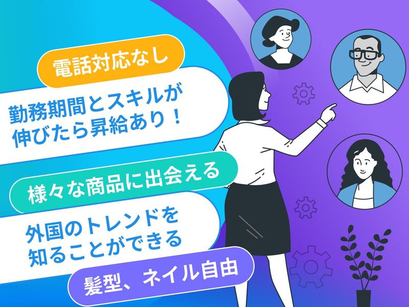 職種/仕事内容 | 仕事内容 \\この求人のポイント!// ☆英語不要&電話対応なしで 安心スタート! ☆事務スキルが身につく♪ ☆日本と世界の「架け橋」 国境を越えて人の役に立てるお仕事 ||◤お仕事について ―――――――――――――――――――― 海外のお客様からの オンライン依頼に基づき、 ネットストアやフリマアプリで 商品を購入するお仕事です。 具体的には ■ネットストアでの仕入れ業務 ■オークションサイトやフリマアプリでの 商品の購買業務 ■出品者とのやり取り (テンプレート通りのメッセージ送信) ※電話対応はありません ■購買に付随するPCでの事務作業 などをお任せします。 ―――――――――――――――――――― |