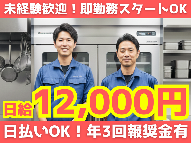職種/仕事内容 | 仕事内容 ✨未経験歓迎!✨ ✅研修・教育が充実! ✅日払いOK! ✅報奨金あり(年3回) ✅フルタイム勤務歓迎! ✅正社員登用あり! ||◤ ̄ ̄ ̄ ̄ ̄ ̄ ̄ ̄ ̄ ̄ ̄ ̄ ̄ ̄ ̄◥|| \面接合格後即勤務開始も大歓迎/ \新生活・社会人デビューも歓迎/ ||◣_______________◢|| メーカーの正規設置・メンテナンス業者 として、飲食店やホテル・病院などへ 業務用冷蔵庫などの入れ替え・新設工事や 自社の倉庫整理をするお仕事です! ⏩具体的な仕事内容  ̄ ̄ ̄ ̄ ̄ ̄ ̄ ̄ ̄ ̄ ・業務用冷蔵庫の設置 ・厨房設備に関する簡単な配管工事、配線 ・倉庫整理 ・車両の掃除 ・事務作業 など ⏩簡単な1日の流れ  ̄ ̄ ̄ ̄ ̄ ̄ ̄ ̄ ̄ ̄ ▼出社 ▼当日のスケジュールを確認し 必要なものの積み込み ▼現場作業(1日2~5件) ▼帰社、倉庫整理 ▼帰宅 ✨残業は現場数により発生する場合あり。 時間外は全額支給。 早上がりも日給全額保証。 ✨2~3名のチーム制。 ⏩キャリアアップを目指すのも可能◎  ̄ ̄ ̄ ̄ ̄ ̄ ̄ ̄ ̄ ̄ ̄ ̄ ̄ ̄ ̄ ̄ ̄ ̄ ✨アルバイトから正社員へ! ✨専門スキルを身につけ、資格取得へ! スキルとキャリアの両方を積んでいけます! 前職が引っ越しスタッフや配送ドライバー、 建築・土木作業員や工場スタッフ、 警備員や飲食店スタッフなどの 採用実績があり、どんな方でも活躍可能♪ |