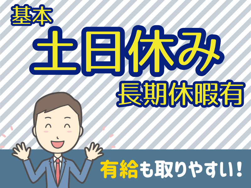 休日休暇 | 休日休暇 土日休み ※年間休日110日以上 ※企業カレンダーにより変動有 GW・夏季・年末年始休暇 有給休暇 |