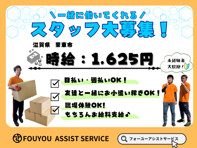 滋賀県栗東市 日払い可/学歴・経験不問/簡単仕分け/ピッキング/Wワーク可/お試し単発、短期可 雑貨仕分け、ピッキングなど・・・ あなたに合ったお仕事で活躍可能! 未経験からのスタートでも、現場責任者がしっかりサポートするから安心です。 誰もが知っている大手企業で充実のワーキングライフを送りませんか? <時間・日数相談OK> 週2日~ライフスタイルに合わせて働けます。 フルタイムでガッツリ稼ぎたい方もOK! Wワークにもオススメ。 まずはあなたの希望を遠慮なく伝えてください♪ <皆さん大歓迎!> 10代~50代までの幅広い年代が活躍中! 友人同士の応募も大歓迎ですよ♪