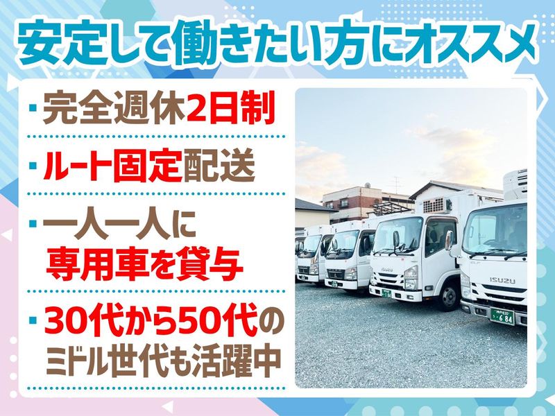 職種/仕事内容 | 仕事内容 ✅完全週休2日制!しっかり休める◎ ✅プライベートをしっかり確保できる! ✅ドライバーの経験なくてもOK ✅30~50代の男性が活躍中です♪ 【具体的には】 2tトラックでの食品配送をお任せ。 ・運ぶものは、お肉やハムなど ・走行距離は1日あたり100キロ前後 ・配送件数は多くても20数件程度 ・地場配送なので、毎日家に帰ることができます ・充実した研修があるので未経験の方も安心 ・最初の1~2日は座学での研修 ・ルート配送で顔見知りのお客様ばかりなので 安心して勤務していただけると思います <1日の流れ> 尼崎の事務所を出発! ↓ *兵庫センター(神戸市西区見津が丘) *池田営業所(池田市神田)で商品の積み込み (大手食品会社の倉庫) ↓ パン屋さんやスーパーなどに配送 お客様先では、伝票のやり取りと検品をお願いします。 元気に挨拶ができたらOK! 【ここがポイント!】 ✨一人一人に専用車を貸与! トラックは自分専用なので 気兼ねなく使ってOKです! 使いやすくカスタマイズすることも 可能なので、愛車として 可愛がってあげてくださいね。 ✨丁寧な研修で安心スタート! 「ドライバーの仕事が初めて!」 という方にはイチからお教えします。 まずは、2週間ほど 先輩の横乗りからスタート! 配送の流れやルートを覚えてもらいます。 様子を見て、「できそう!」と思ったら ドライバーデビュー! 不安なまま放り出すことは ありませんので、安心してくださいね。 \少しでも気になったらお電話を◎/ TEL:06-6435-3006 不在の場合は:080-4970-4700(サカモトまで) 【一緒に働くスタッフについて】 現在は、30~50代の男性が6名活躍中! 社長は穏やか&気さくで話しやすい人柄です。 ドライバー未経験からスタートした先輩も いるので、新人さんの気持ちが よくわかるんです◎ 先輩後輩の垣根もあまりなく 家族のように温かい雰囲気です♪ 真面目にコツコツ仕事をしてくれる方が多いです。 すぐに慣れていただける環境だと思います。 【先輩スタッフよりコメント】 なんと言ってもうちのアピールポイントは “働きやすさ”だと思います! 週に2回固定でお休みがあるので、 家族旅行や友達との予定が立てやすいです。 仕事とプライベートにメリハリをつけて 働きたい方にはピッタリの環境です。 ドライバーの仕事をしたことがない方も 横乗りからスタートして、 効率のいい回り方などもお教えするのでご安心くださいね。 |