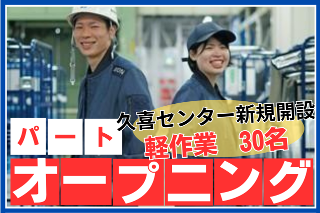 \オープニング募集×18時30分スタート/未経験OKの軽作業パート/週3日~OK/ショート時間 \久喜市に新センターOPEN!/ 新拠点のオープニングスタッフ募集/未経験・扶養内OK 総合物流企業《ギオン》がオープニングパートスタッフを大募集します! 「久しぶりの仕事復帰」「家庭と両立しながら働きたい」 「未経験から新しい仕事に挑戦したい」…そんなあなたを応援します みんな一斉スタートの今がチャンス!安心して始められる環境です◎ ■ 働きやすさがしっかり整っています ・日勤固定で家庭とも両立しやすい! ・週3日~OK! 無理なく働けるシフト制 ・ 重い荷物は少なめ! シニアや女性も活躍中 ・ 福利厚生充実! 社割・持株会・資格支援制度など待遇多数