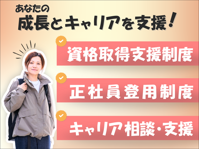待遇・福利厚生 | 【保険制度】 雇用保険、労災保険、健康保険、厚生年金 【福利厚生】 待遇・福利厚生 【福利厚生】 ■交通費規定支給 ■制服貸与(作業服・作業靴) ■賞与(年2回) ■退職金(規定有り) ■社員登用制度 (2年前後で正社員へ登用となります) ■昇給あり(経験・スキル等により) ■各種手当あり ■有給休暇あり(6ヶ月後10日付与) ■慶事休暇あり (結婚・配偶者出産・忌引き) ■慶弔見舞金 (結婚・出産・葬祭・傷病・災害) ■食堂あり ★昼食代補助あり♪(規定あり) ■鍵付きロッカーあり ■休憩室あり (自販機、給茶機、 電子レンジ、冷蔵庫、TV) ■喫煙所あり(屋外) ■更衣室あり ■定期健康診断/特殊健康診断 ■メンタルヘルスチェック (年1回実施) ■無料の資格取得制度 (300以上) ■キャリア応援・相談・研修制度あり ■福利厚生サービス (全国保養所・店舗割引) ★☆★入寮OK!寮費無料!★☆★ ・ワンルーム寮 ・家電付き ・光熱費補助あり ご相談下さい♪ |